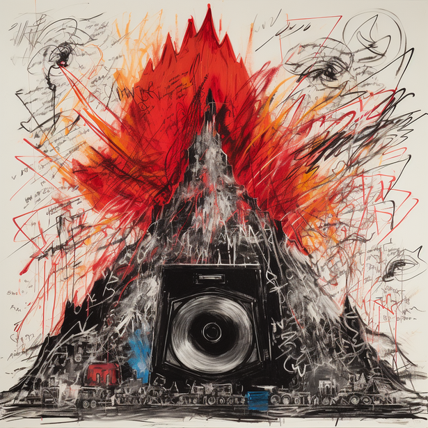 The artwork presents a vibrant interplay of visual elements evoking a sense of dynamics. Central to the composition is a speaker from which an eruption reminiscent of a volcanic explosion emerges. This central motif suggests a powerful release of energy, likely symbolic of the impact of sound or music. The explosive form is rendered in fiery reds and oranges, colors traditionally associated with passion, power, and urgency, reinforcing the intensity of the subject.