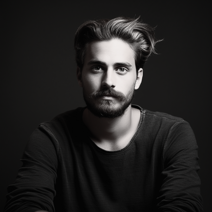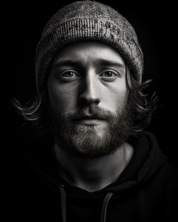 black and white documentary photograph of a 25 year old man, freckles, beanie, nose ring, monochrome gradients, intricate details, low key lighting, side lighting, dark shadows, deep blacks --ar 4:5 --style raw