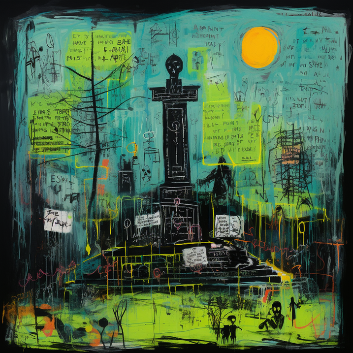 Around this central structure, the landscape is streaked with vibrant greens and yellows, contrasting with the somber tones typically associated with graveyards. This use of color could represent life persisting amidst death, or the vibrancy of the memories held within this space. The presence of various figures and scribbles throughout the scene imbues it with a sense of activity and perhaps the echoes of lives once lived.