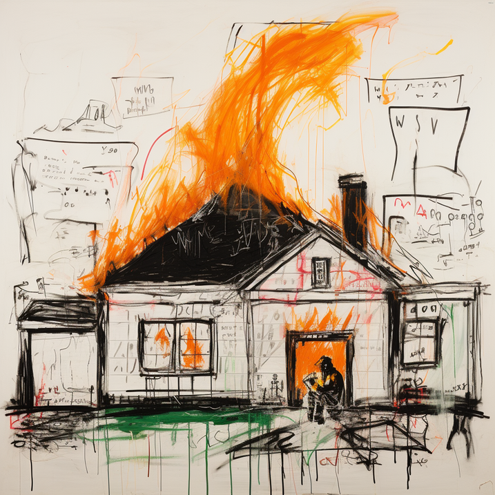 The house itself is outlined with bold, assertive lines, suggesting a certain stability and permanence that is being challenged by the fire. The fire's position atop the house could indicate that the threat or change it represents is “all-encompassing.”