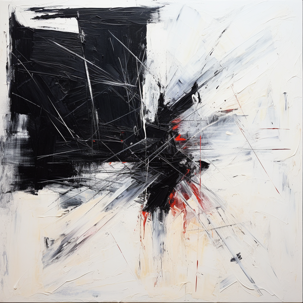 This abstract composition is a dynamic interplay of forceful gestural strokes and controlled chaos. Dominated by a stark contrast between black and white, the painting features bursts of sharp lines that radiate from a central nexus, where a dense, dark mass anchors the piece. Hints of red add a focal point of color, suggesting intensity and perhaps violent disruption within the otherwise monochromatic scheme.