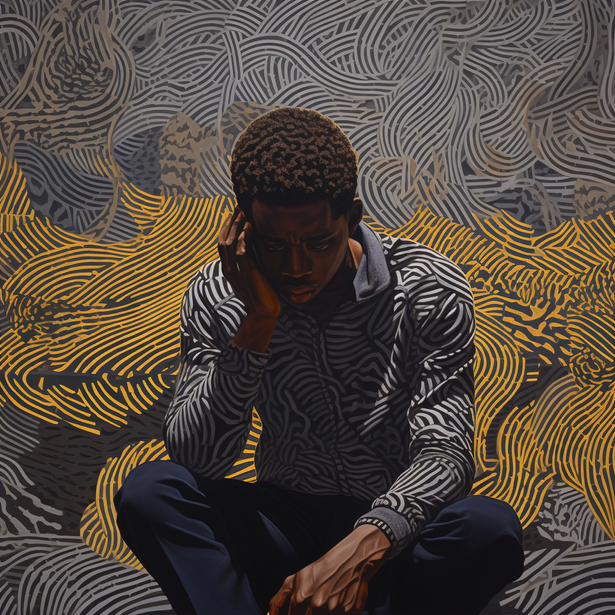 The artwork presents a striking interplay of pattern and realism, creating a visual narrative that is both bold and introspective. The subject, a young man deep in thought, is rendered with a naturalistic approach, contrasting sharply with the abstract, swirling patterns that envelop him.
