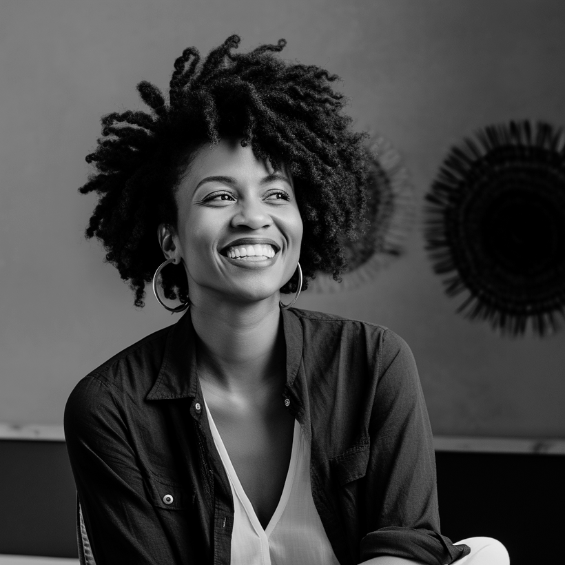 A Photorealistic portrait of 28 year old dark-skinned African woman with coily hair and smile lines against an art studio background. frame the shot tightly to emphasize the nose, pores, and facial hair while maintaining overall balance. Photo angle is captured from the side capturing mainly her side features. Posed sitting down in a photoshoot. Medium: photography. Style: deeply cinematic capturing individual details and textures of the subject’s skin. Lighting: macro ring light and diffuser panel for even illumination providing a gentle contrast that highlights the photorealism. Composition: Nikon D850 DSLR camera, Nikon AF-S Micro-IKKOR 105mm f/2.8G lens, ISO sensitivity: 64, shutter speed: 1/250s to balance natural and artificial lighting, –ar 16:9 –style raw