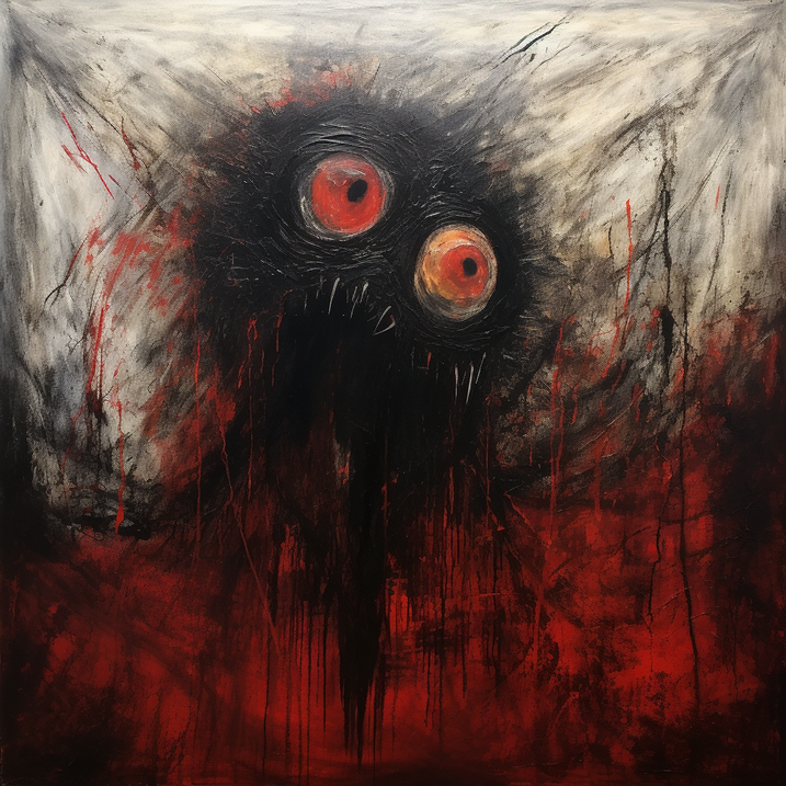 The painting presents a captivating interplay of light and dark, where stark contrasts emphasize emotional intensity. Red, often associated with passion or urgency, dominates the canvas, creating an almost visceral response within the viewer. The dripping effect, suggests a sense of movement or bleeding—the physicality of pain. The circular forms, command attention as the focal point. They resemble eyes, imbuing the composition with a sense of being watched, adding a layer of psychological depth.